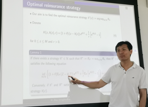 讲座伊始,周明教授首先回顾了Cramer-Lundberg模型中破产概率指数上界的概念,并将其作为研究再保险问题的出发点。他强调,在风险管理的背景下,保险公司和再保险公司之间的异质信念性是一个不容忽视的问题。这种异质性可能导致双方在制定再保险策略时出现分歧,进而影响整个风险转移体系的效率。为了应对这一挑战,周教授提出了以Cramer-Lundberg指数最大化为价值函数的最优再保险策略,并证明了一种具有有限参数的特定形式的再保险是实现这一策略的有效途径。讲座中,周明教授还详细介绍了分段修改技术,该技术能够扩展之前研究的方法和结果,使其更加适用于异质信念性下的再保险问题;他通过具体案例,展示了在几种具有代表性的异质信念下,如何运用这种方法制定明确的再保险策略。