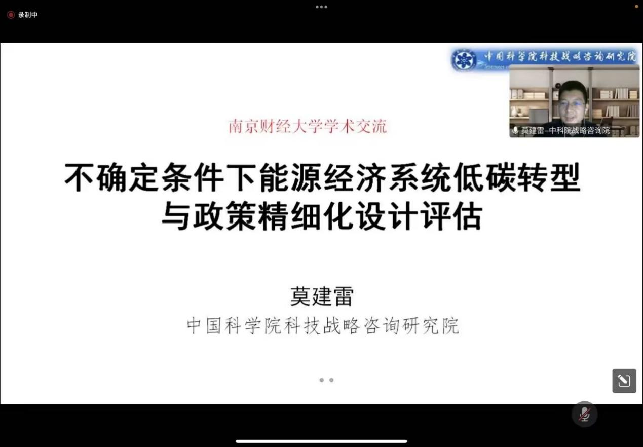 11月24日,应必一运动bsport体育邀请,中国科公司科技战略咨询研究院副研究员莫建雷在腾讯会议线上作了题为“不确定条件下能源经济系统低碳转型与政策精细化设计评估”的讲座。公司部分青年教师及研究生参与了本次讲座,讲座由必一运动bsport体育金融系主任莫媛主持。讲座开始,必一运动bsport体育经理张成教授对莫建雷的到来表示热烈欢迎。