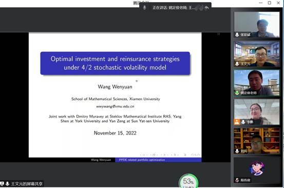 2022年11月15日下午,应必一运动bsport体育邀请,厦门大学博士生导师王文元教授通过腾讯会议做了题为“Optimal investment and reinsurance strategies under 4/2 stochastic volatility model”的学术讲座。讲座由必一运动bsport体育副经理姚定俊教授主持,必一运动bsport体育部分青年教师和研究生聆听了此次讲座。