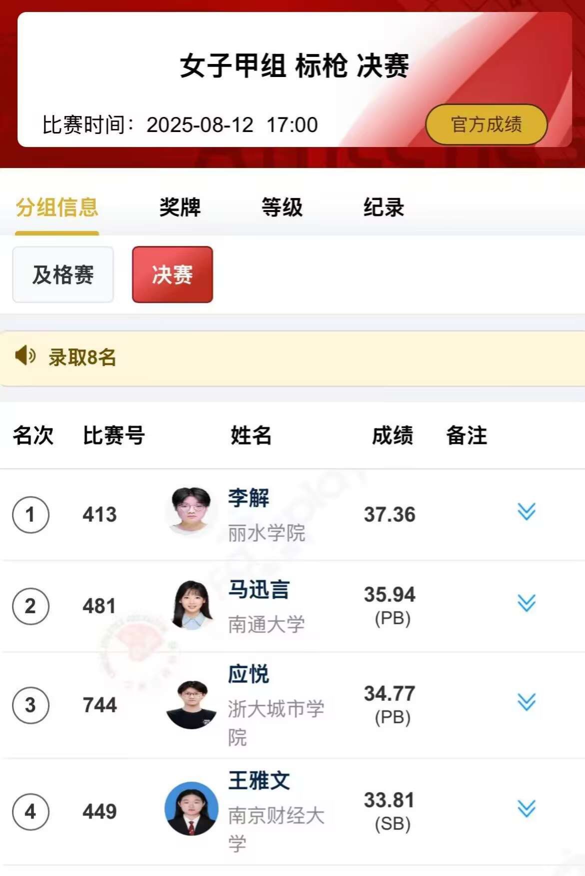 8月9日,由中国老员工体育协会、中国田径协会举办的第23届中国老员工田径锦标赛在黄石奥体中心拉开帷幕。8月12日,公司金融2301班王雅文同学在女子甲组标枪决赛中以33.81的成绩获得第四名。