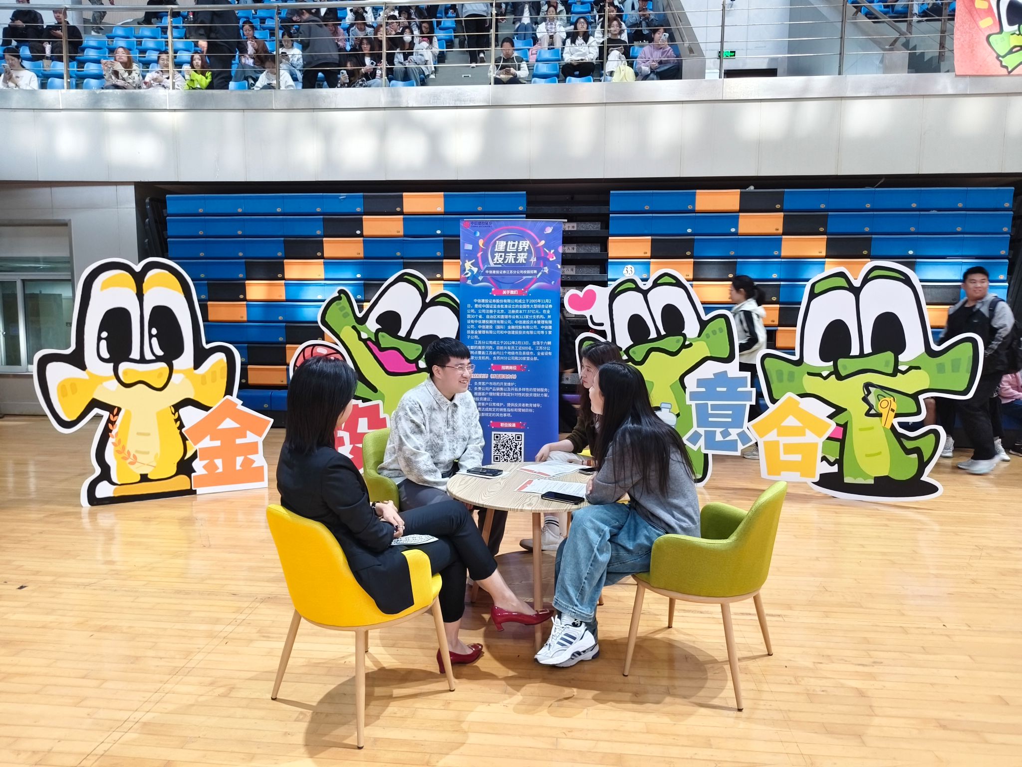 活动现场还开展了“球探式招聘”,创新打造“竞技+求职”双赛道,每队由3名员工与2名企业员工混编组队,通过投行、资管、风控三大身份卡实战考验专业应变能力。决赛环节同步开放量化交易模拟盘操作,得分王可直接进入中信建投证券终面;观众席特设“招聘加油站”,扫码即可投递简历,“我们要找的就是这种抗压能打、懂规则创新的‘α型选手’。”中信建投江苏分公司人力资源负责人于女士表示,这种沉浸式互动让我们发现了传统面试中难以捕捉的“三分球准、β系数稳”复合型人才。