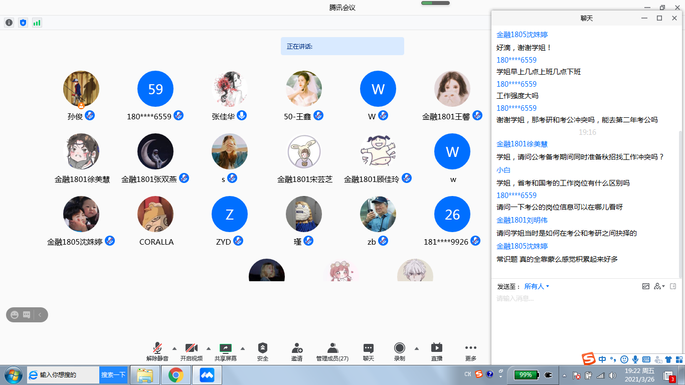 为帮助公司大三同学更全面了解求职就业信息,3月26日晚6点半,公司金融学系孙俊老师主持召开“商业银行、公务员招录专场线上求职经验分享会”。报告人分别为公司金融2016级员工张佳华,现就职于国家税务总局上海市徐汇区税务局;金融2016级员工王鑫,现就职于招商银行南京分行,春招还收到中信银行杭州分行、光大证券南京、招商证券上海等Offer。