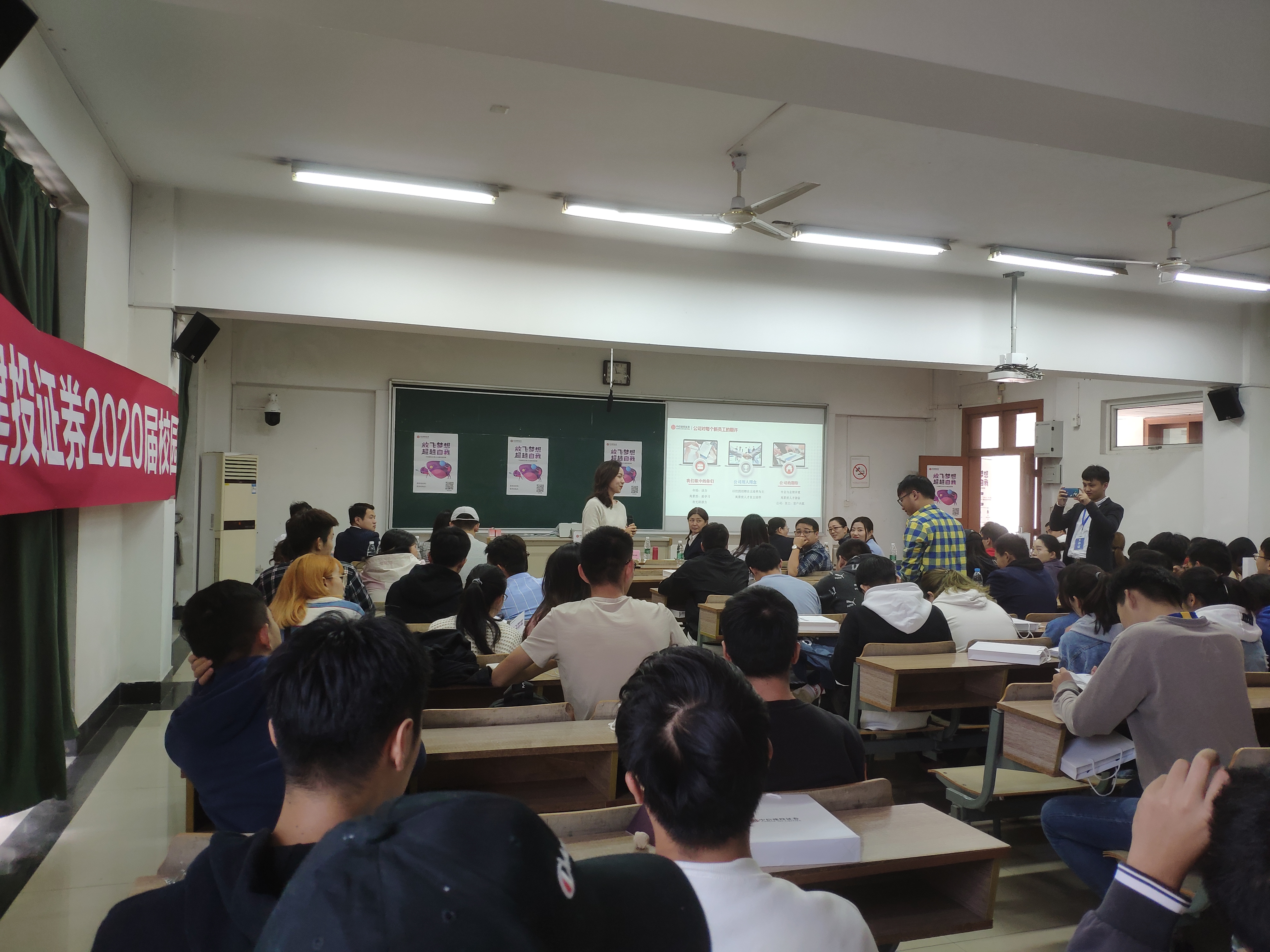 首先由中信建投人力资源部于甜经理简要地介绍了中信建投证券的经营范围,紧接着,中信建投证券的孔总介绍了中信建投证券从校园招聘、社会招聘中引进人才,然后给每个人配备完美的人才培养体系。该体系包括内部培训、外部学习和企业化培训。随后,三位南财员工分别讲述了自己多年在中信建投证券的从业经历,经过多年的行业沉浸和努力工作,都已晋升为营业部副总,并向学弟学妹做了就业求职的小建议和经验分享。