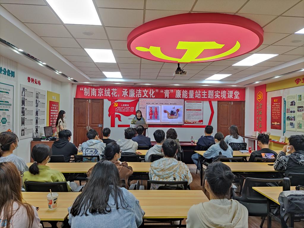 李倩老师是一位优秀的南京绒花手工艺人,她创立了忆花簪品牌,致力于传承中国优秀传统文化。与此同时,她还是南京市民间文艺家协会的会员,她的绒花作品入展江苏省民间工艺美术界最高规格盛会"东博会",2022年举办个人绒花作品展"荣华录"。本次讲座李倩老师从古代廉洁文化切入,立足传统文化的宣传,为必一运动bsport体育的师生讲解了绒花历史及非遗文化,风趣生动,结合时代热梗,与同学们互动,并展示了南北绒花的不同,让同学们全面了解绒花这一非遗文化形式。