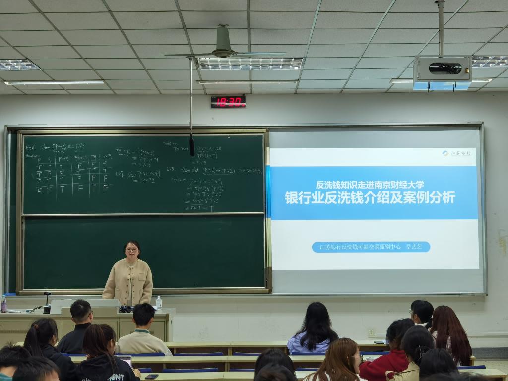 岳艺艺从国际和国内反洗钱法律法规入手,结合当前我国商业银行反洗钱工作的开展情况,深入剖析了银行业务中涉及的网络诈骗、地下钱庄、非法吸收公众存款、集资诈骗、传销、赌博、信用卡套现、套路贷等8种典型案例,用通俗易懂的语言向同学们讲解各类洗钱行为的危害,提醒同学们要增强洗钱风险防范意识,树立科学理性消费观念。她以江苏银行为例,介绍了银行业反洗钱工作的社会意义和工作内容,强调反洗钱工作任重道远,需要社会各界共同参与,也需要更多人才加入反洗钱队伍。