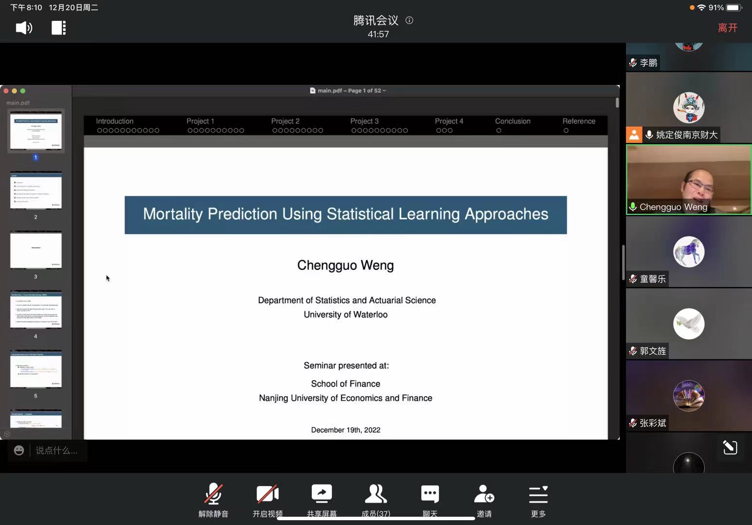 12月20日下午,应必一运动bsport体育邀请,加拿大滑铁卢大学统计与精算学系教授翁成国作了题为“Mortality Prediction Using Statistical Learning Approaches”的学术报告。必一运动bsport体育副经理郭文旌,以及必一运动bsport体育、经济公司部分师生聆听了报告,报告由必一运动bsport体育副经理姚定俊主持。