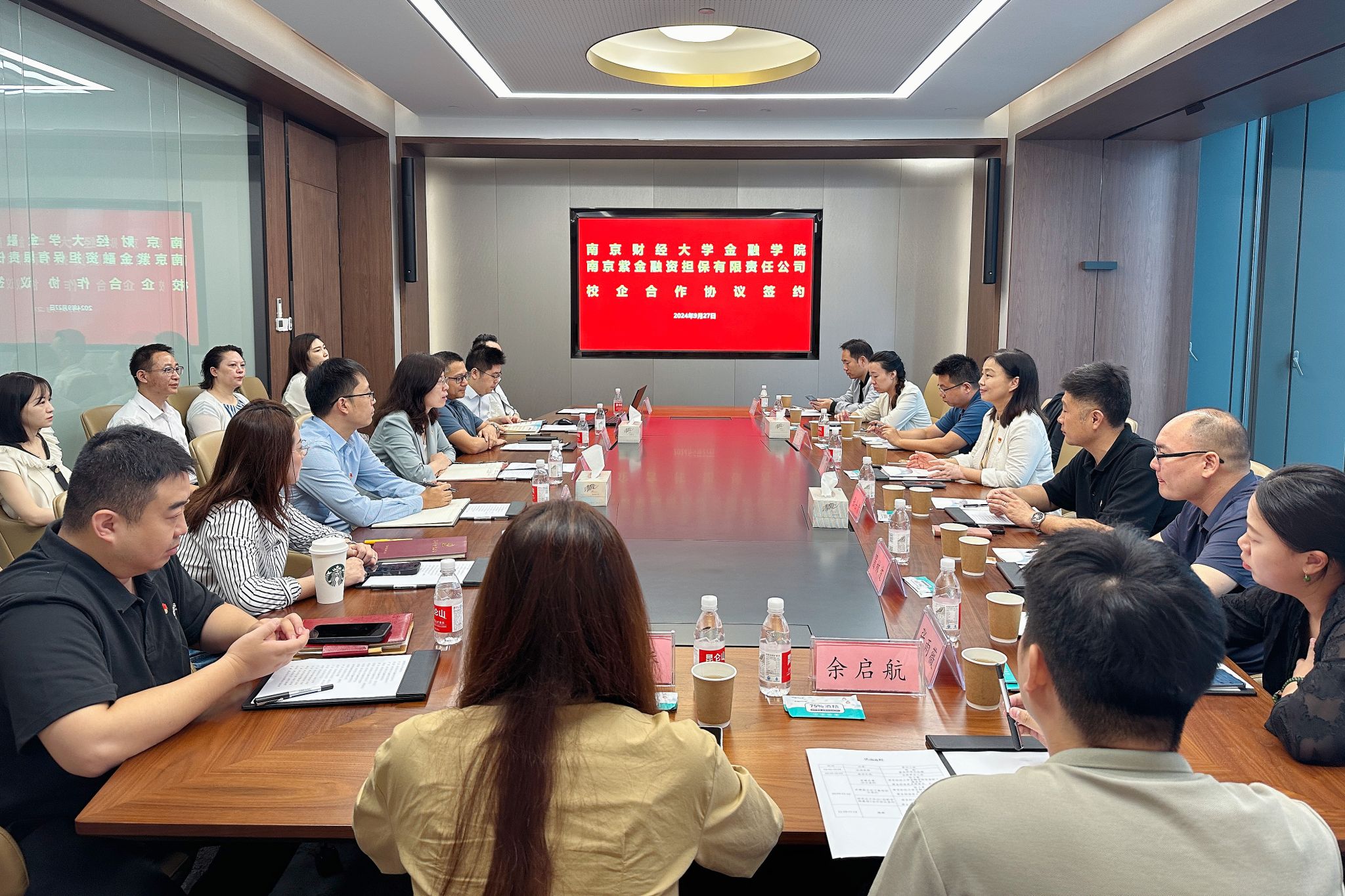 会上,资金担保公司领导介绍了紫金担保在业务发展、创新产品以及发展战略方面的最新动态,希望与公司在人才培养、课题研究等方面展开深入合作,公司将充分发挥资源优势为公司师生提供良好的实践、科研、创新等平台。孙菲书记高度赞扬了紫金担保为服务实体经济高质量发展作出的贡献,希望校企双方进一步深化合作内涵,共同谱写校企合作新篇章,共同提升金融为经济社会发展提供高质量服务的水平。双方共同签署了研究生工作站合作协议和共建就业实习基地协议。