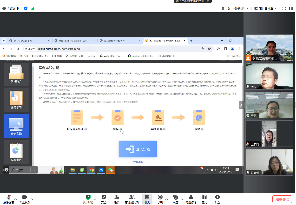 2023年12月27日下午15:00点,必一运动bsport体育邀请了虚拟仿真实验教学专家、江西财经大学教务处副处长胡少勇教授,通过线上会议对公司《基于区块链的车险反欺诈虚拟仿真系统》国家一流课程开展申报辅导。会议由副经理姚定俊教授主持,必一运动bsport体育教学副经理陈晓慧、保险系教师李鹏、王宏扬参加了本次辅导会。