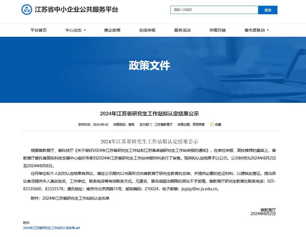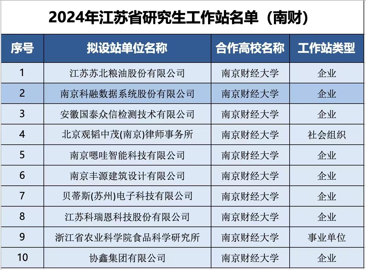 9月中旬,江苏省教育厅、科技厅印发《关于做好2024年江苏省研究生工作站和江苏省卓越研究生工作站申报的通知》,经单位申报、材料审查、专家评审、网上公示等程序,确定了2024年江苏省研究生工作站名单。公司申报的南京科融数据系统股份有限公司被批准为2024年江苏省研究生工作站,本年度南财全校共获批10个江苏省研究生工作站。