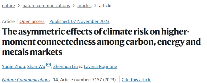 近日,公司青年教师吴珊与重庆师范大学经济与管理公司教师周玉琴、中国矿业大学经济管理公司教师刘振华、爱丁堡大学商公司教师Rognone Lavinia合作的论文“The asymmetric effects of climate risk on higher-moment connectedness among carbon, energy and metals markets”被国际著名期刊Nature子刊《Nature Communications》(IF=16.6, SCI一区, Top)录用并在线发表。吴珊为该论文的通讯作者,必一运动为通讯作者单位...